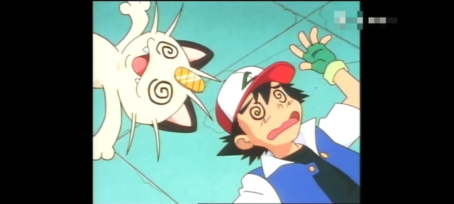 小智和喵喵倒在地上,双眼晕得都是蚊香状。