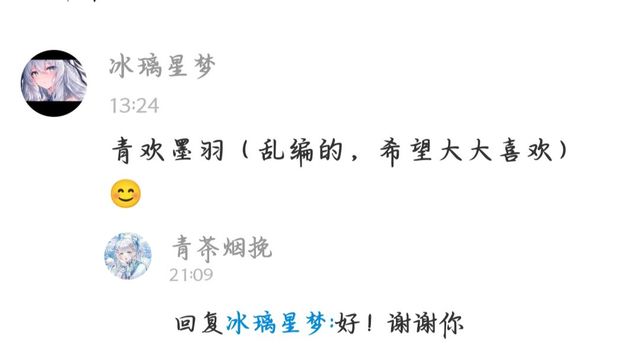 青欢墨羽我!青茶烟挽改网名了,叫——青欢墨羽!谢谢冰璃星梦!