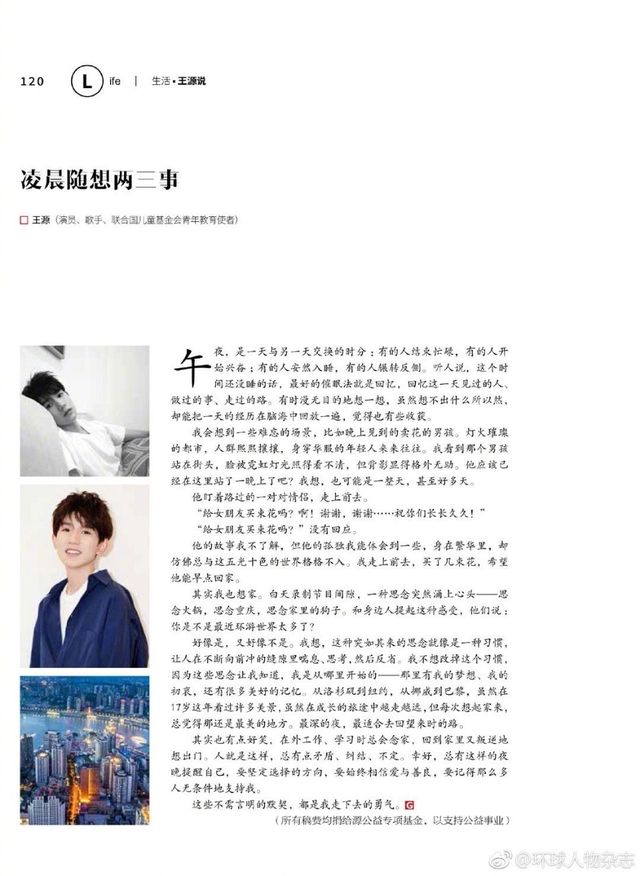 好像是,又好像不是。我想,这种突如其来的思念就像是一种习惯,让人在不断向前冲的缝隙里喘息、思考,然后反省。我不想改掉这个习惯,因为这些思念让我知道,我是从哪里开始的——那里有我的梦想、我的初哀,还有很多美好的记忆。从洛杉矶到纽约,从挪威到巴黎,虽然在17岁这年看过许多美景,虽然在成长的旅途中越走越远,但每次想起家来,总觉得那还是最美的地方。最深的夜,最适合去回望来时的路。