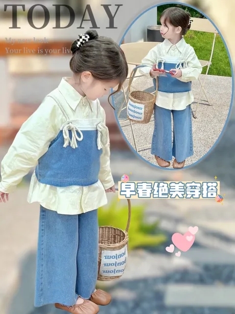 微卷短发,米白色衬衫,牛仔吊带马甲,搭配一条牛仔阔腿裤背着书包的小女孩拉着一旁的小男孩跑到刚夺冠的AG众人面前