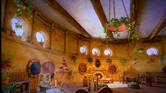 圆形的低顶房间散发着淡淡泥土芬芳,宽敞的空间交错摆放着黑黄相间的软垫沙发和椅子。墙上很多地方都挂着光洁锃亮的铜饰,屋子里也有很多植物,有从天花板垂挂下来的,也有放置在窗台上的。通过圆形的窗户,你甚至可以看到摇曳的青草和蒲公英。