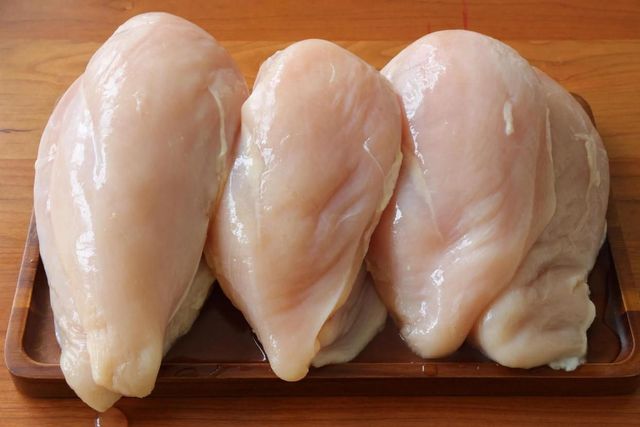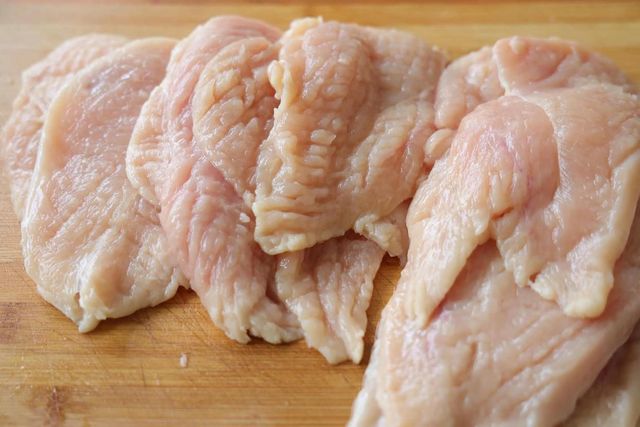 先把鸡胸肉处理干净,把筋膜全部去掉,然后对半切开,用刀背捶一捶,把肉锤散,可以更好地入味儿;