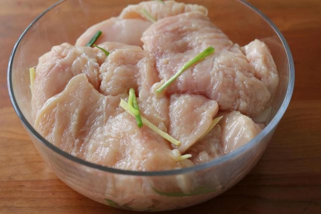 处理好的鸡胸肉放在大碗中,加入葱、酱、料酒抓拌均匀,腌一会儿;