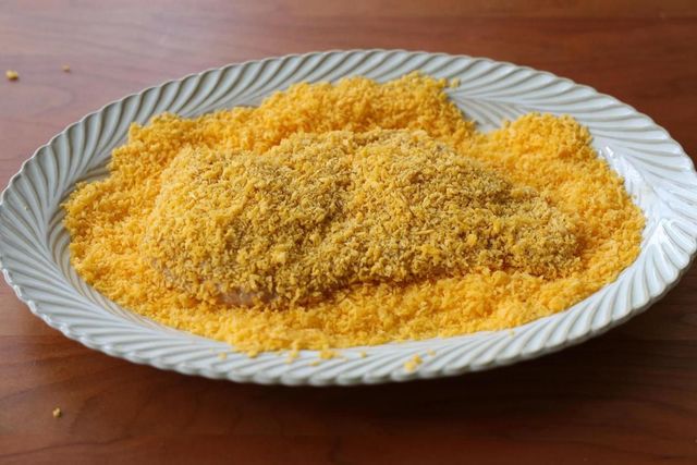 直接裹上面包糠,放在平底锅里煎8-10分钟左右;煎至两面金黄色即可