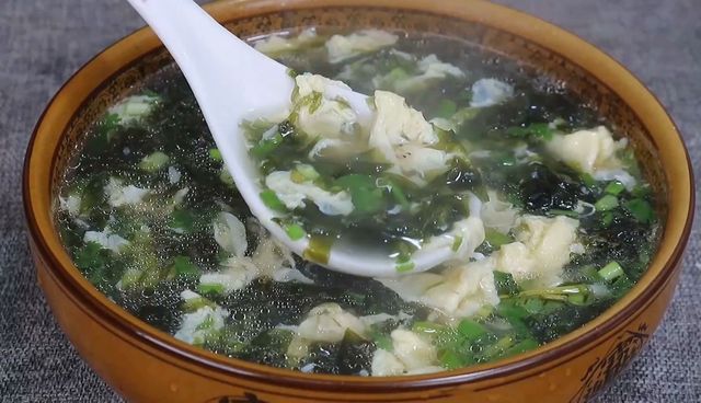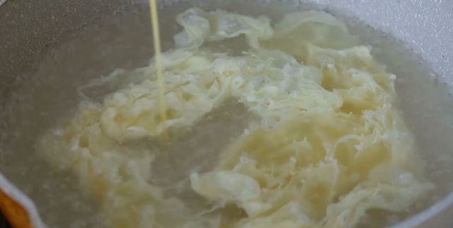 接下来将鸡蛋液直接淋入到锅中,这样才能够形成比较好看的蛋花,而且不会起沫,鸡蛋花煮熟之后咱们直接将鸡蛋汤浇在紫菜碗里面,然后在碗里面滴上几滴香油,搅拌均匀就可以喝了。