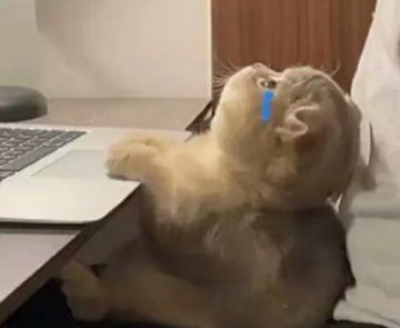 卡蹦卡坐在笔记本电脑前,有些委屈巴巴