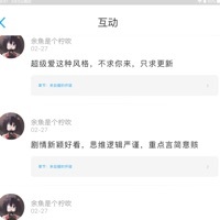 作者小晚然后呢就是余魚大大看看我留的言就是最近想找人合作写因为本身没思路然后看大大的文也没有思路