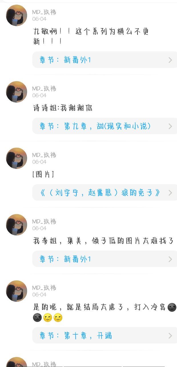 太感动了,我一个初一的,整天就想有人给评论,结果,我遇到一位最niec的人,她给我的每章都评论: