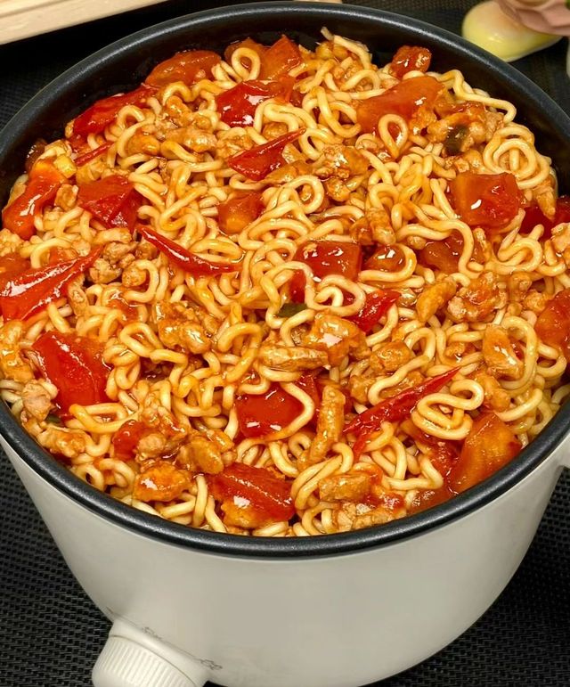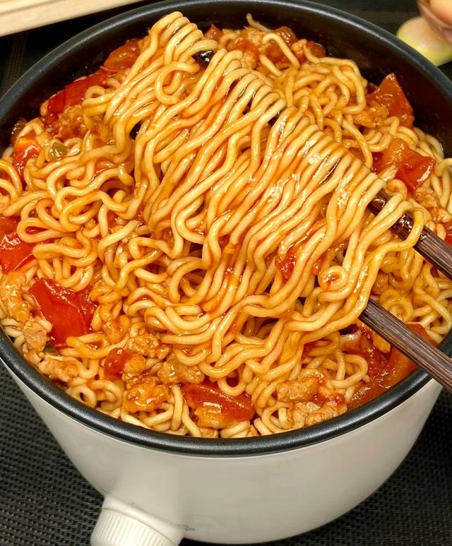 走在她对面,给她盛面,小孩喜欢吃小西红柿,那就多给她夹点