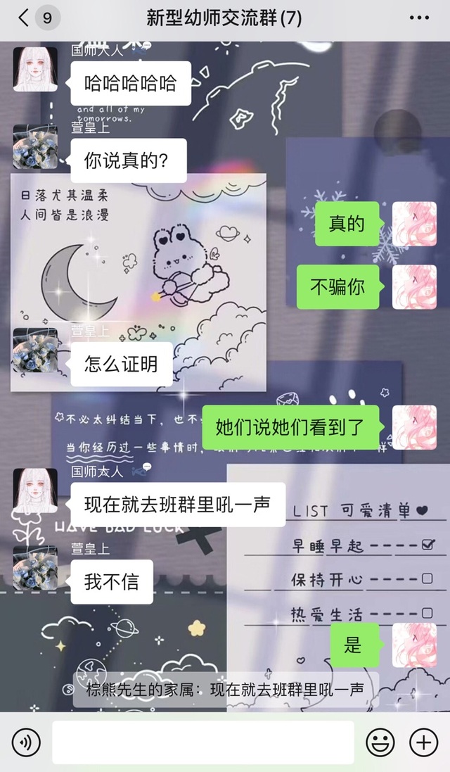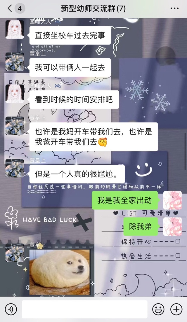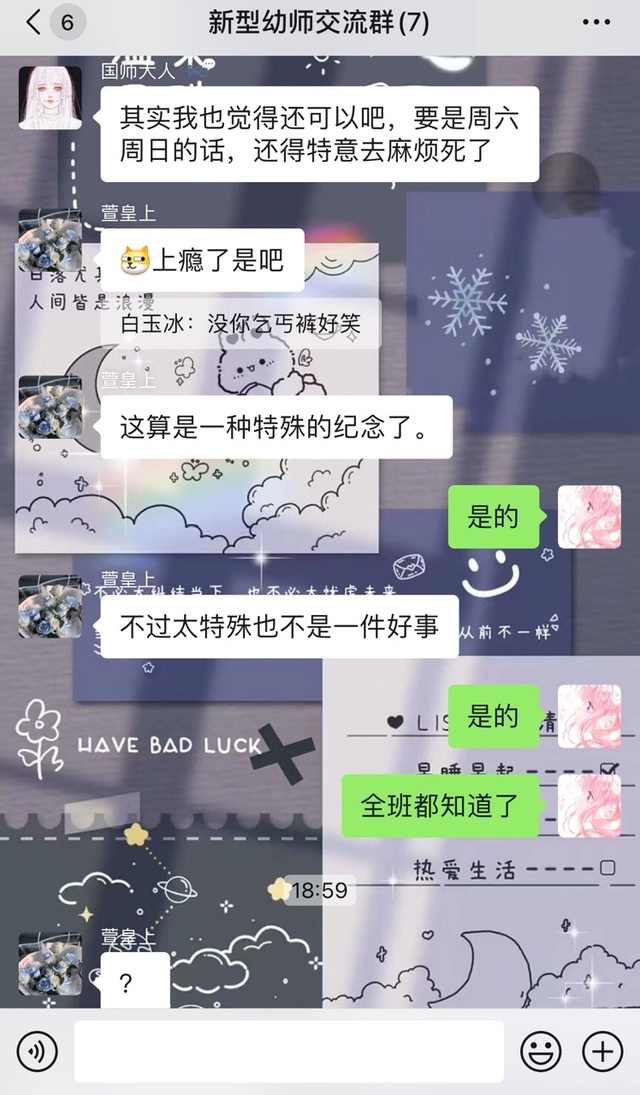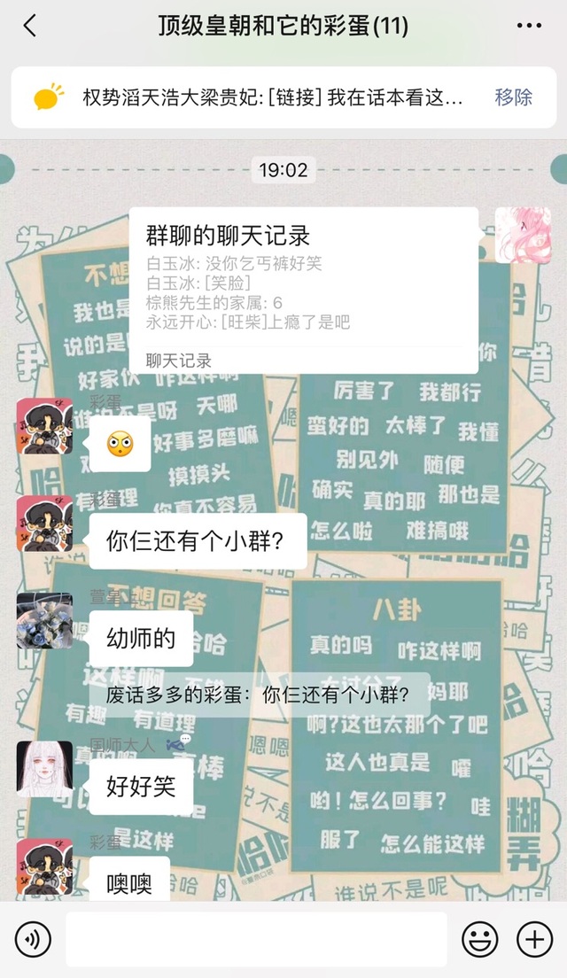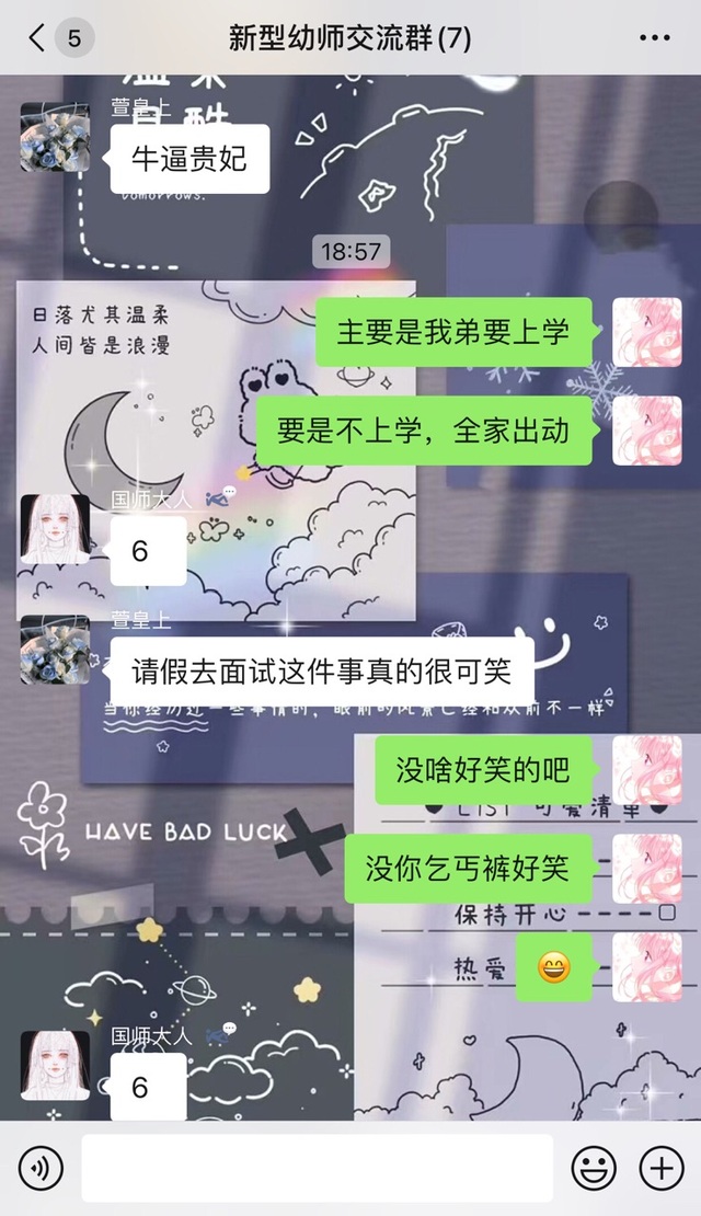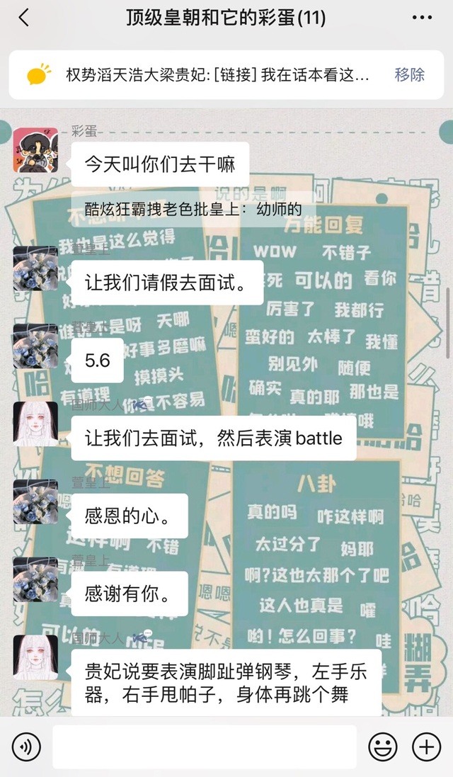 因为贵妃,贤妃,皇上,国师,太师都要参加幼师面试,就和其他参赛者又建了一个群(群里都是自己班面试同学)