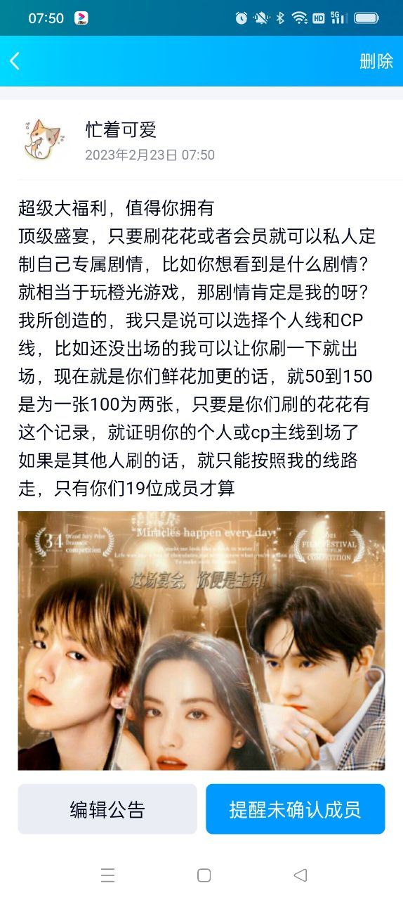 作者鲜花三张,为她个人的私人定制场,因为他也是主角之一,所以只有19成员可以自由选择个人线CP线,只需要刷花花或会员
