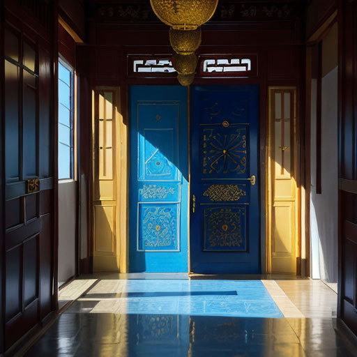 辛灵沿着金色的长廊一直往前走,只见旁边的门都散发着金光,走了不知多久,前方出现一个蓝色漩涡式的门。