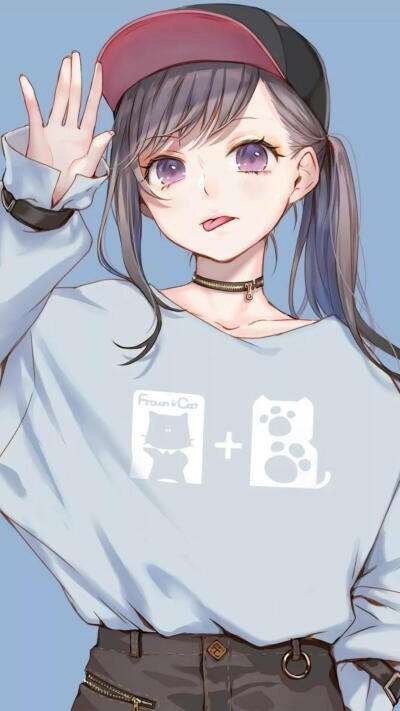 衣着外貌:星星耳坠,鸭舌帽,单马尾,白色卫衣,紫色眼睛,蓝色牛仔马甲,黑色牛仔裤