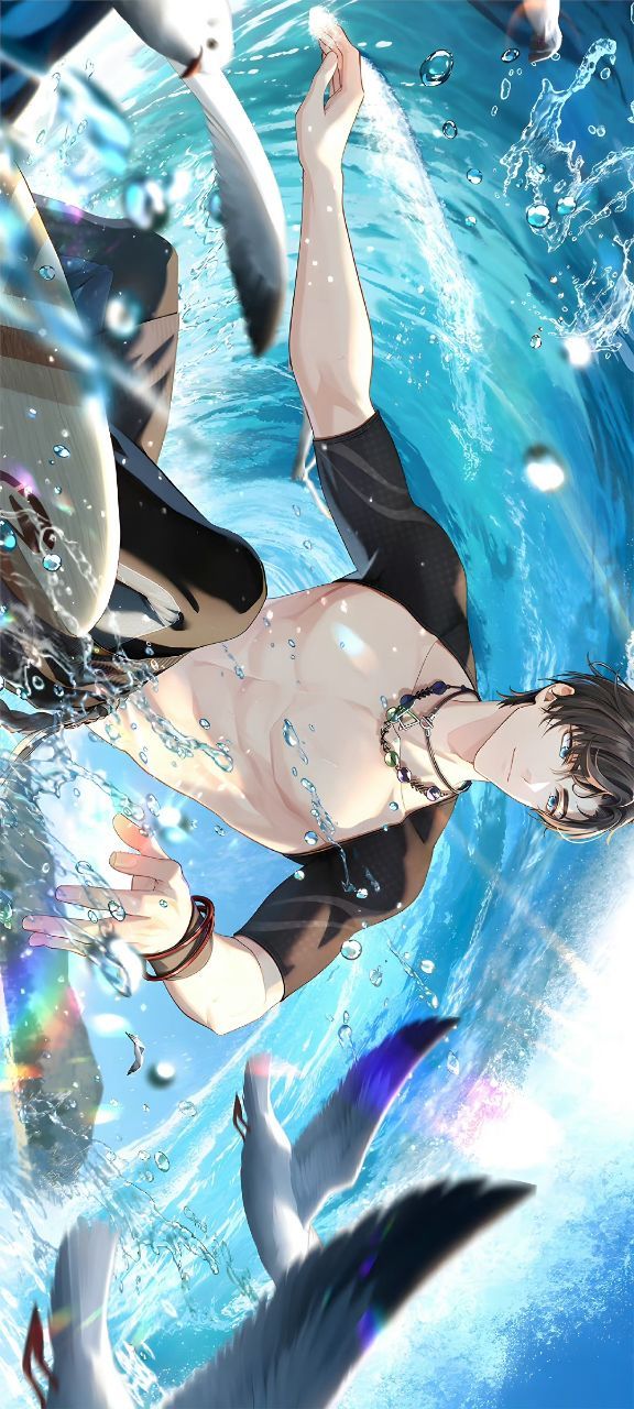 左然踏着浪而出,他额前的发丝随风飘起,周身散落的晶莹水珠在太阳的折射下发出的耀眼的光芒。