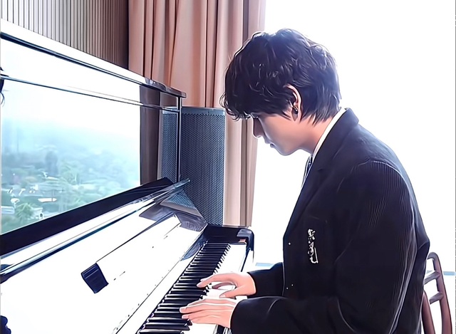 金泰亨独自坐在钢琴前,明媚的阳光照在他的身上,微卷的黑发盖在眼前,将他明亮的眼睛遮挡住了一半。身着黑色的西装,显得格外优雅。略带倦意的面容,透露着舒适安静。手指轻轻弹动着钢琴键,在空气中荡漾出旋律的余韵。一曲终了,房间慢慢恢复了寂静。
