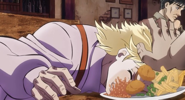 就在迪奥伸手去拿的时候,突然XX将迪奥的脑袋按在食物里