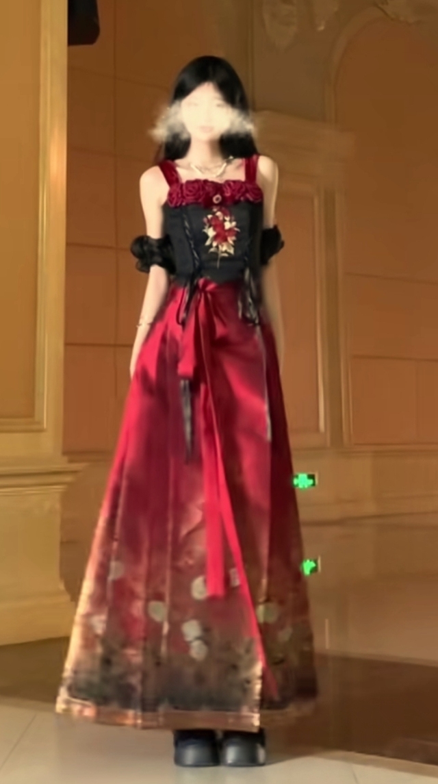 此刻,林软软身着一款名为“爱神玫瑰”的马面裙国风礼服,宛若画卷中的仙子步入现实。她的上衣是一件红黑交织、绣以精致玫瑰图案的紧身胸衣,与之搭配的马面裙采用红黑渐变色调,金银丝线勾勒出朵朵盛放的玫瑰,二者相得益彰,完美勾勒出她那傲人的身姿。一对红宝石耳坠随动作轻轻摇曳,散发着迷人的光芒。她将长发绾于脑后,一支银色蝴蝶簪子点缀其间,仿佛随时都会振翅欲飞,增添了几分生动与灵气。