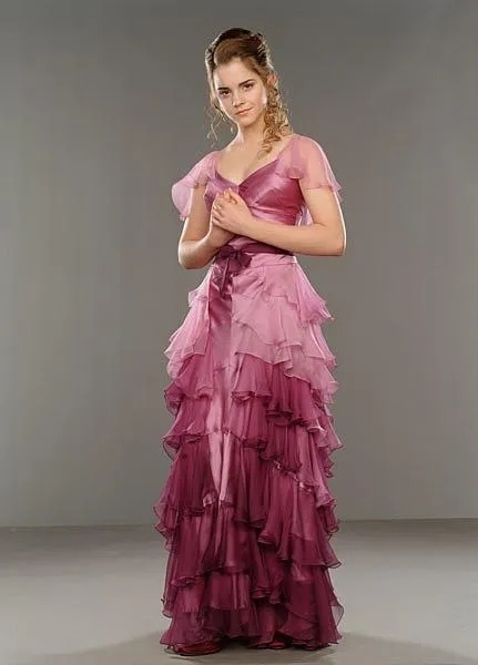 赫敏身着一袭粉紫交织的长款礼服,其剪裁精致无比。紧身上衣巧妙勾勒出她曼妙的身姿曲线,而那轻盈飘逸、层层叠叠的蓬松裙摆,则更添几分优雅与灵动。设计师在细节之处同样倾注了匠心,领口与袖口点缀着细腻的蕾丝花边,不仅为整体造型平添了几许甜美气息,更是与赫敏本身的温婉气质相映成趣,相得益彰。