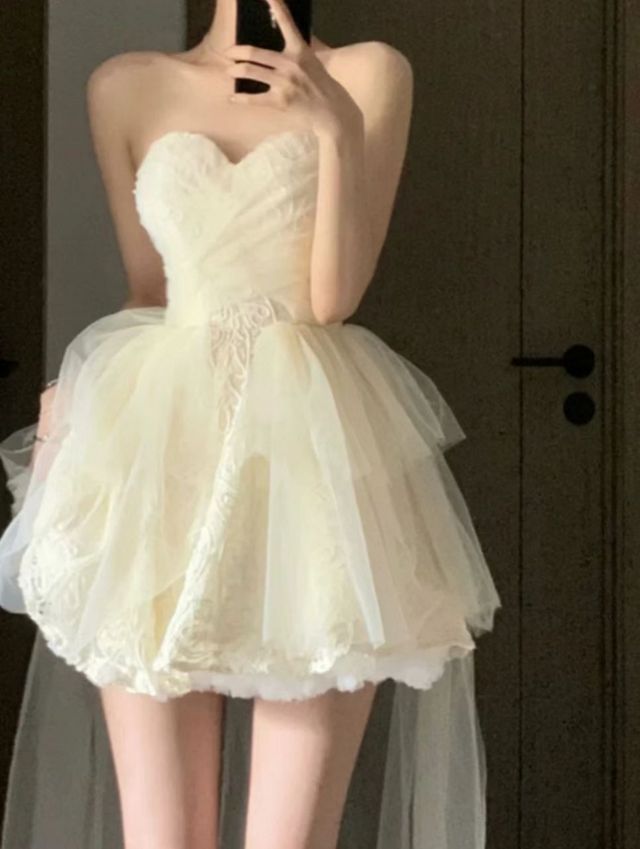 楚储背着背包走到大厅后台换衣间,背包里面是化妆品和礼服,她选了一件裙摆较短的拖尾公主裙,比较素,但很好看