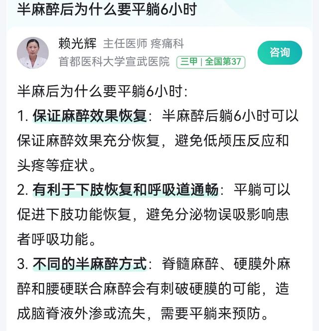 三日月桃子半麻醉后不需要平躺6小时吗……