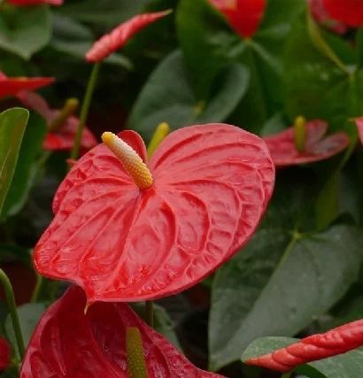 花烛,别称红鹅掌、火鹤花、安祖花、红掌。叶柄细长,佛焰苞平出,革质并有蜡质光泽,橙红色或猩红色;肉穗花序黄色,可常年开花不断。