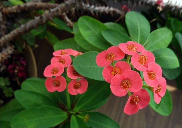虎刺梅大概是最小巧的花朵,不像杜鹃花那样灿烂似锦,也不如水仙那样纯洁高雅,更比不上牡丹的艳丽富贵,却也活得像模像样,枝头上依然开着小花蕾粉嫩可爱,入花木凋零的冬季,只有虎刺梅凌寒不败,几朵鲜红的小花绽放其间,愈显得风姿绰约,倒给居室增添了不少春意。