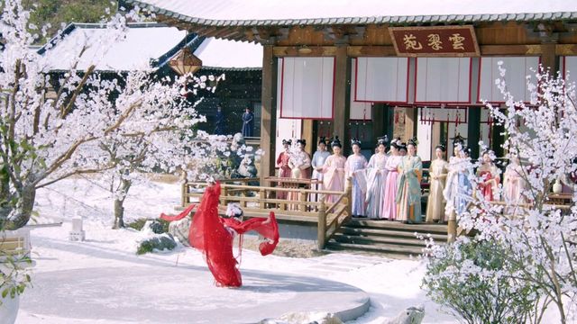 花琉璃舞起几步雪缓缓落下,大家都高兴地小声呼叫起来,花琉璃一笑继续起舞。伴着渐渐变大的点点白雪与花琉璃火红的舞衣相互呼应,就连不知何时到来观望的太子殿下也沉迷其中。