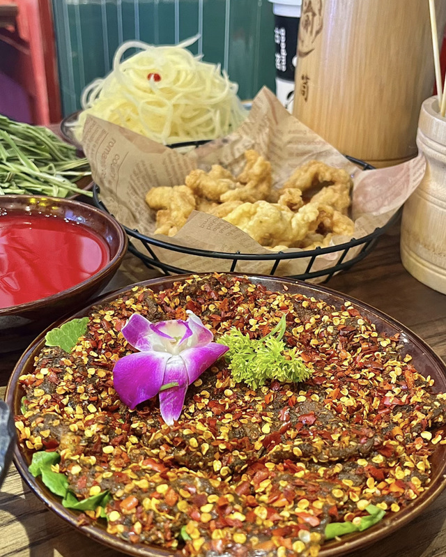 两人点了好多菜,有毛肚,鸭肠,虾滑,郡肝,鸭血,吊龙,牛上脑,还有煮的很入味的各种卤味:耙鸡爪,Q弹的猪蹄,当然还有必不可少配火锅的蛋炒饭!
