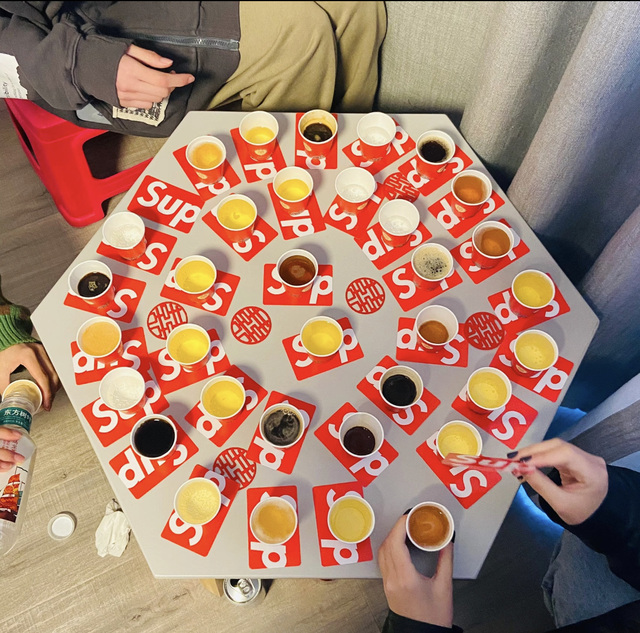 规则:每个杯子里放一张扑克,兄弟团喝完一杯就翻一张牌,直到翻出5211314,翻错就继续游戏。