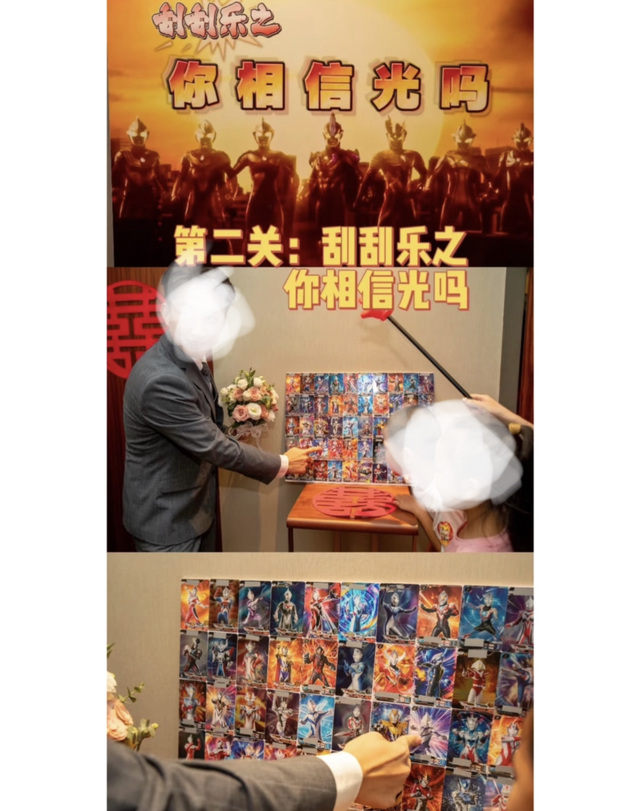 第二关:刮刮乐之你相信光吗。小朋友的最爱6◎准备了KT板,正面是自己p的照片背面贴满奥特曼卡片,再买刮刮乐贴纸把卡片上奥特曼的名字贴住。