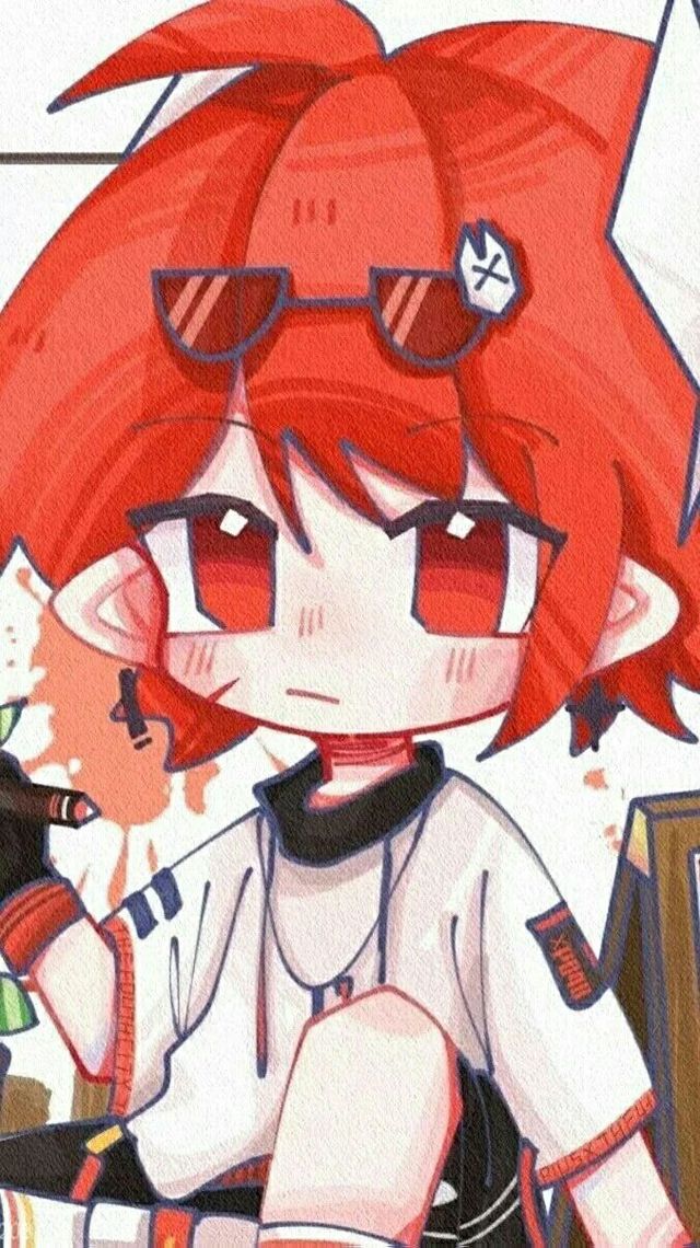 红色长发,戴着黑色眼罩和一身黑色的衣服穿着黑色的鞋子。后面有像鱼尾巴的蓝色装饰。