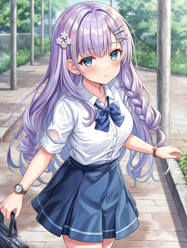 一个淡紫色长发,浅蓝色眼睛的女孩抱怨道,她的头发披散在身上,有些卷卷的样子,头发帘左侧卡着两个银白色的发卡,一个是侧V形的,一个是由4朵小花组成的,她穿着白色的校服,胸前打着蝴蝶结,袖子卷到了一半,上边的校服被塞到了下面蓝色的校裙中,纤细的身材被映衬出来,左手带着一个很复古的手表,有些生气的往前走着。