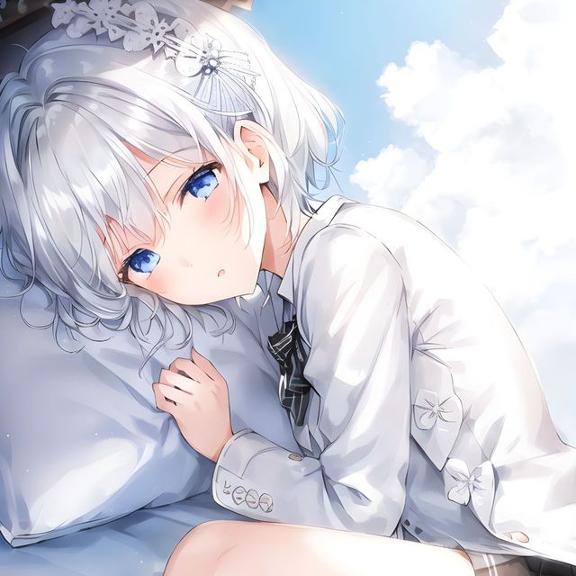 一个银白色短发的女孩正趴在沫阳的位置上,她的头上带着一个白黄色的小猫发卡,穿着一件白色单薄的外套,下面穿着一天淡蓝色的牛仔裤,女孩熟睡的样子很治愈的。