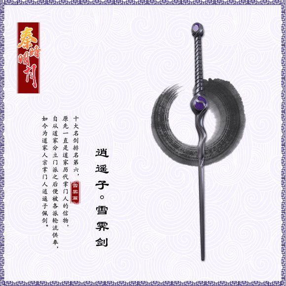 无题武器背景 三百年前,道家因为对“道”的理解不同,分裂为天宗和人宗,一直争斗不休。天宗、人宗分裂之后,争夺的焦点便是那把祖师传下的镇门之剑“雪霁”。双方约定每五年比试一次,胜者即可执掌“雪霁”。[1] 武器剑主 角色简介 图片 赤松子(详见对应百度百科词条): 晓梦前一任的道家天宗掌门,虽年逾七旬,但修为已接近天人合一的境界,已经连续三轮执掌“雪霁”,败给道家人宗掌门逍遥子后,第二年就去世了。赤松子去世后,由他的师妹晓梦接任道家天宗掌门。[1] 赤松子 逍遥子(详见对应百度百科词条): 道家人宗掌门,实力不凡,行踪飘忽,神龙见首不见尾。暗中联合其他门派们逐渐一起走上了反秦之路。