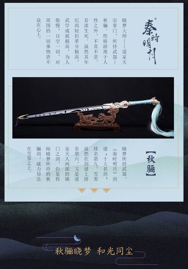 无题秋骊 《秦时明月》系列中的佩剑 秋骊,中国3D武侠动画《秦时明月》系列中,道家天宗掌门晓梦的佩剑,风胡子剑谱“十大名剑”排名第九。 (注:该剑为该动画原创。历史或温世仁原著小说中均无此剑。) 中文名 秋骊 别名 秋骊剑 登场作品 动画《秦时明月》系列及动画衍生作品 排名 风胡子剑谱“十大名剑”排名第九 所属门派 道家天宗 剑主 晓梦 初次提及 动画第4部第32集 初次登场 动画第5部第4集