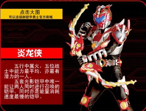 无题炎龙侠 国产特摄剧《铠甲勇士》中的铠甲勇士 炎龙侠是国产特摄剧《铠甲勇士》中登场的铠甲勇士,铠甲勇士系列首个正式登场的铠甲勇士,TV版主角。 是以红色为主色调,龙为图腾的铠甲。是太阳赐予火影石力量的火之铠甲,五千年前太阳守护者向地球发射赐予了了五颗光影石再与地球五行中的火元素所结合,拥有地球五行中的火元素力量。 主要召唤人为李炘南,张健、殿南也召唤过炎龙铠甲。 五行铠甲本身没有强弱之分,战斗表现有好坏差异,主要是因为召唤人和环境的缘故。召唤人越强和自身心态越好,铠甲的威力亦越高。召唤人若心神不定或体质较弱,就很难发挥铠甲的极限实力。五套光影铠甲中唯一能让两人同时进行召唤的铠甲,是光影五铠中能量最多的、能量消耗速度最慢、潜力最深不可测,以及各项数据最平均的光影铠甲。 中文名 炎龙侠 外文名 Dragon Armor 别名 炎龙铠甲、炎龙 饰演 李炘南(吴建飞) 张健(沈人杰) 殿南(张殿菲) 梅志刚(皮套演员) 配音 吴建飞、沈人杰、张殿菲 性别 男 登场作品 铠甲勇士 铠甲勇士之帝皇侠 属性 火 类型 均衡型 召唤器 炎龙召唤器 武器 烈焰刀、烈焰弓、烈焰镖 封印技 火焰拳(另有爆发型) 特殊能力 时间停止 动物图案 红色的龙头 坐骑 炎龙驹 代表颜色 红色