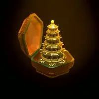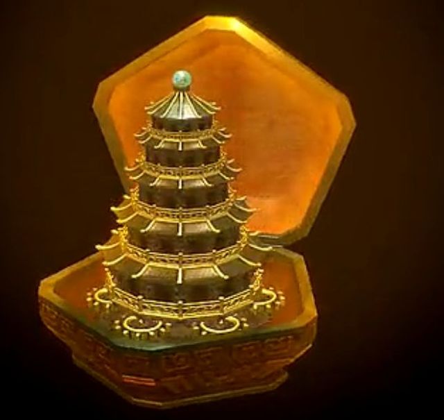 无题造型 幻音宝盒外形为五边形木盒,外表为红色。打开后,里面有着一座可以自动升降的宝塔。宝塔整体金碧辉煌,第二部中宝塔整体为金色,第三部开始宝塔的栏杆和上面刻的字为金色,宝塔的墙壁和飞檐为古青色。宝塔顶部有一圆珠,第二部中珠子的颜色可随宝塔转动由金色变为翡翠蓝,第三部开始珠子一直为翡翠蓝。底部有着大量可以操纵宝塔升降的金色齿轮。 第四部造型