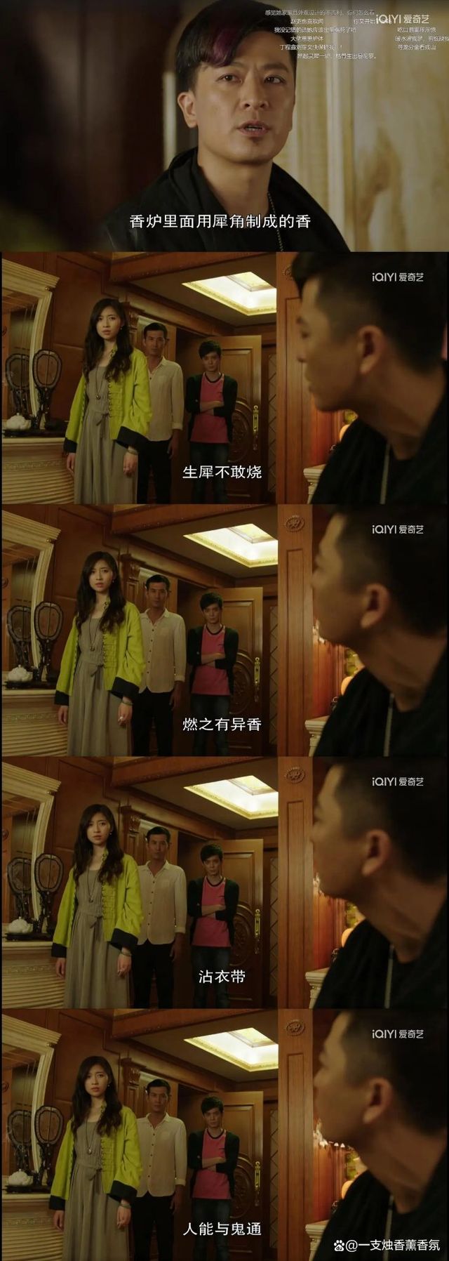 无题2、返魂香与犀牛角 其实返魂香与犀牛角综上所述是没有什么关联的,只不过返魂香有招魂引魄、起死回生的奇效加之我国古代确有用犀牛角制香的习惯(名唤“灵犀香”),以及温峤用犀角通阴阳的故事,后世可能就将两者直接联系在一起使用,以增添影视剧的观赏性,从《灵魂摆渡》呈现的犀角香我们就能看出,其色黑如桑椹,不就与香谱中的返魂香颜色如出一辙么。