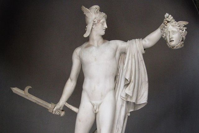 无题取回梅杜莎首级 佩耳修斯成人的时候波吕得克忒斯想将她的母亲列为王妃,因而对片刻不离其左右的佩耳修斯心生厌恶。得知了国王对自己厌恶之情的佩耳修斯请求国王给他一匹马,做为报答他将取回梅杜莎的首级。 梅杜莎是有着蛇发的丑恶魔女,是戈耳工三姐妹中最小的一个。她们三人原本是非常美丽的少女,但是她们的美丽遭到众神的嫉妒,把她们身心都变化为丑恶的形态。 神的儿子佩耳修斯得到了奥林波斯众神的帮助,他先找到了合称为格赖埃的三个白发女妖,她们也是梅杜莎的姐妹。格赖埃三姐妹共用一只眼睛,一颗牙齿。佩耳修斯先用巧计把她们共同的牙齿和眼睛偷来,迫使她们说出寻找一位女仙的道路。他从女仙那里得到了登云鞋、隐身盔和神囊( 据另一传说,则是格赖埃有此三宝,佩耳修斯偷了她们共用的眼睛和牙齿,把这三件宝物换到手)。赫尔墨斯将能杀死魔怪的曲折圣剑HAR PE交给佩耳修斯使用,而女神雅典娜将表面发光的内含雅典娜画像的盾牌赠给了他。 当佩耳修斯找到梅杜莎的时候,她正在睡觉。因为任何人看到梅杜莎都会石化,因此不能接近她 。佩耳修斯用哈德斯之兜隐身,并利用雅典娜的盾牌照出梅杜莎的所在,用手持的曲剑砍下了她的头颅。 梅杜莎虽然死了,但是她的头颅仍然不安全,佩耳修斯将她的首级放入神囊之中。