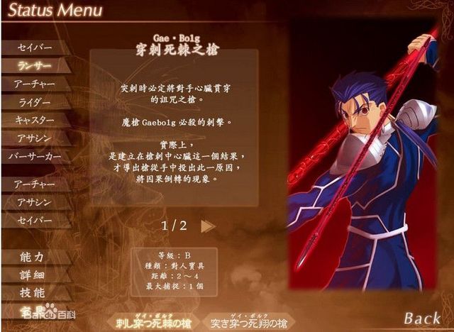 无题对抗手段 对抗此枪的手段有四个:一、不算是方法的方法,在Lancer使用之前将其击破,不让他有机会使用。二、如Berserker这般拥有死后自动复苏的技能。三、作出比这把枪的魔力更强的防御壁。四、拥有能将已经决定的命运扭转的强运。 因为有着必定刺穿心脏的特征再加上能以最小的动作取得最大的战果,还有使用一次只需消费两位数左右的魔力,可说是性价比极高的宝具。据Saber判断就算连续使用七次也不需要补充魔力。一般的Servent在经过数回的战斗之后就不得不休息,而Lancer在一对一的情况下可以实现六连战,就是拜这消耗极少的对人宝具所赐。若是库丘林将其投掷,宝具则变成对军宝具,只有正面防御抵挡。