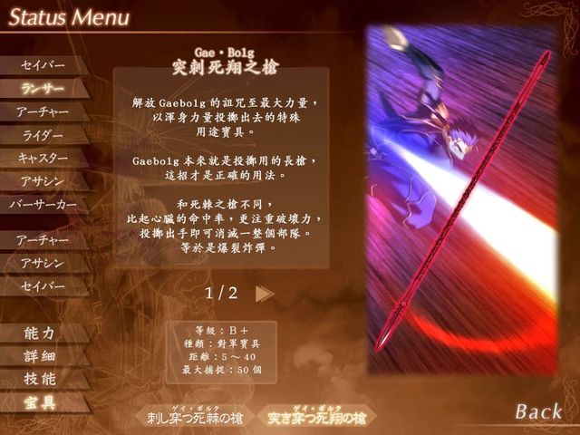 无题最大捕捉 最大捕捉:50人 使用Gae Bolg的最大最强之攻击。传说里提及的“向敌人放出就会发散出无数箭镞的攻击”,就是这个“突刺死翔之枪”。助跑后高高地升到上空,从该处对地面用浑身的力量投掷来发动。 和“穿刺死棘之枪”不同,比起对心脏的命中率,更注重破坏力。是包含对手的四周在内进行攻击的如同地毯式轰炸的招式,其威力可以一举吹跑一支军队,如同爆裂炸弹一般。而且纵然对手有强固的防壁,或是轻快地闪身,枪即使被挡开或者被躲开,也依然会再次朝着目标飞去,直至贯穿目标为止。 在传说中,魔枪被认为是分散成30枝倾盆而降,可是英灵化后其数量似乎为之增长了。伤害力、形状全都逼近光之神鲁格的“轰击五星(Brionac)”,但“无论对方怎么躲都能贯穿对手”的能力, 却又偏似北欧主神奥丁的“大神宣言(Gungnir)”。Lancer在UBW线里用此宝具贯穿了Archer投影出来的“炽天覆七重圆环(Lo Aias)”,因此Archer评价说这招已经超越了原型的“大神宣言(Gungnir)”。 突穿之死翔枪