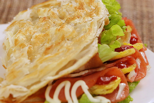 无题手抓饼原名葱抓饼,起源于台湾。新鲜出炉后的手抓饼,千层百叠,层如薄纸,用手抓之,面丝千连,其外层金黄酥脆,内层柔软白嫩,一股葱油与面筋的香味扑鼻而来,让每个人来不及等待,抓起就吃。至今一直风靡全国,可搭配鸡蛋、猪肉叉烧、牛肉饼、粮心香肠、藤椒鸡排、培根、蔬菜等辅料,也可搭配酱爆汁、孜然香辣酱、番茄沙司、麻辣汁、甜辣酱、甜味沙拉酱等酱料,香酥可口,老少皆宜。现有原味、葱香芝麻味、全麦味和梅干菜味,共四种口味。在家也可轻松烹制!