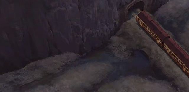 两人探出头看着一个电车从隧道中钻了出来,朝桥的另一头行驶过去,千寻连忙往桥的另一边跑去。