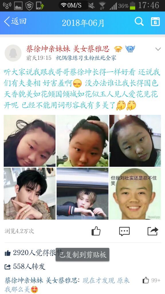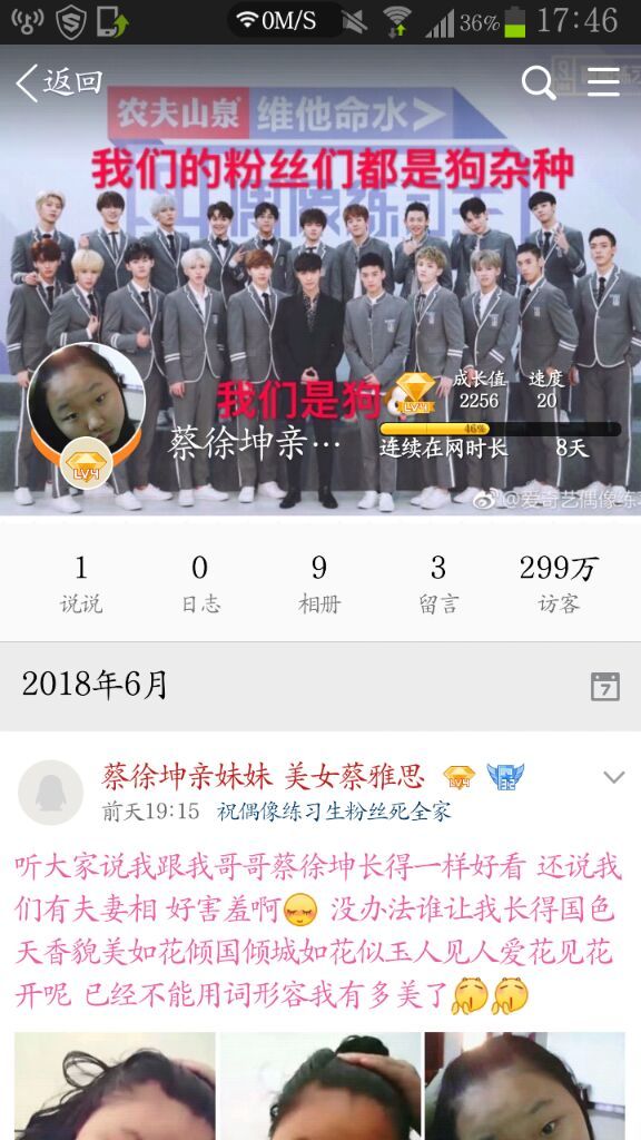 吴璇韵我从QQ上看到一个非常不要脸的人,说什么“蔡徐坤是她哥”还说什么“别人总说我和我哥长得很像”