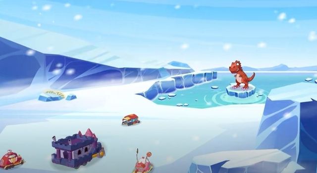 而在,冰面之上,恐龙正在追逐喜羊羊与灰太狼。