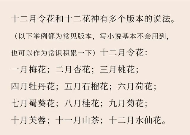 栎河落十二月令花和十二花神有多个版本的说法。 (以下举例都为常见版本,写小说基本不会用到, 也可以作为常识积累一下)十二月令花: 一月梅花;二月杏花;三月桃花; 四月牡丹花;五月石榴花;六月荷花; 七月蜀葵花;八月桂花;九月菊花; 十月芙蓉;十一月山茶;十二月水仙花。