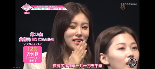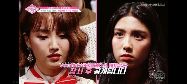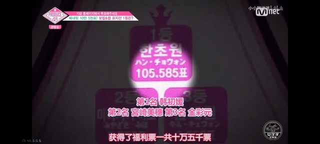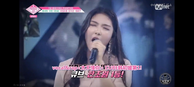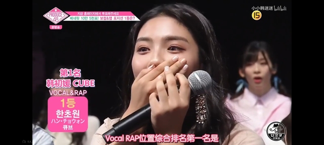 宝拉:Vocal RAP位置综合排名第一名是获得现场投票585票的CUBE韩初媛练习生,获得了福利票一共十万五千票