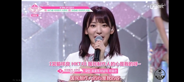 “最终第1候补练习生,HKT48宫脇咲良练习生和STARSHIP张媛曦练习生,现在通过画面看到的练习生,是最终第1和第2的主人公”