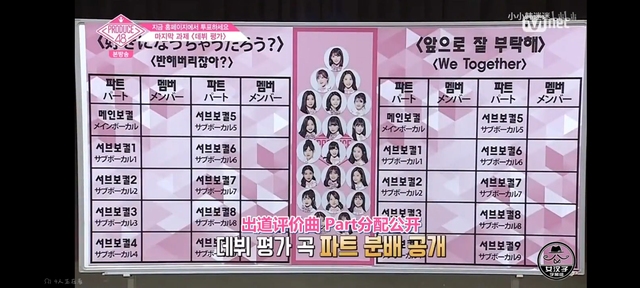 每首歌10人,总共分为两队准备出道评价舞台,出道评价曲选择及Part分配从第20名练习生开始,在想要的歌曲个part上贴上自己的名字,更上位的练习生在选择时,如果当自己想要的part被其他练习生贴了名字,挤掉先选择的练习生,占领自己想要的歌曲和part。当然,也能移动她的歌曲