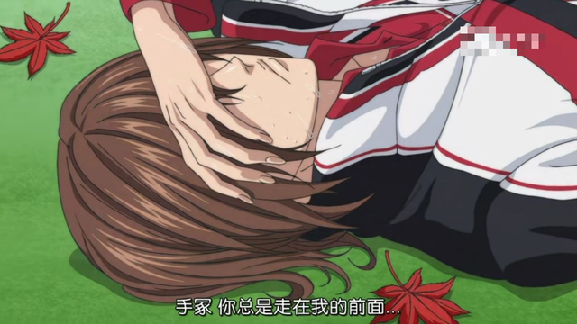 那时比赛已经结束,天上下起了蒙蒙细雨,深秋时节,枫叶被秋风携带者向下飘落,他的身影孤寂,就这么缓慢的下落,不二用手腕遮住自己的眼睛,眼泪却还是不争气的掉下来,枫叶刚好掉落在不二周身,落寞中又有几分柔弱。